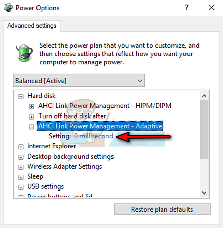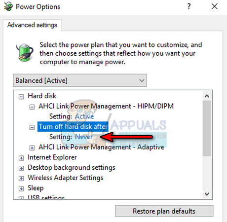 Set Turn Hard Disk After to Never - Then double-click on AHCI Link Power Management – Adaptive and set its Setting dropdown to 0 milliseconds.