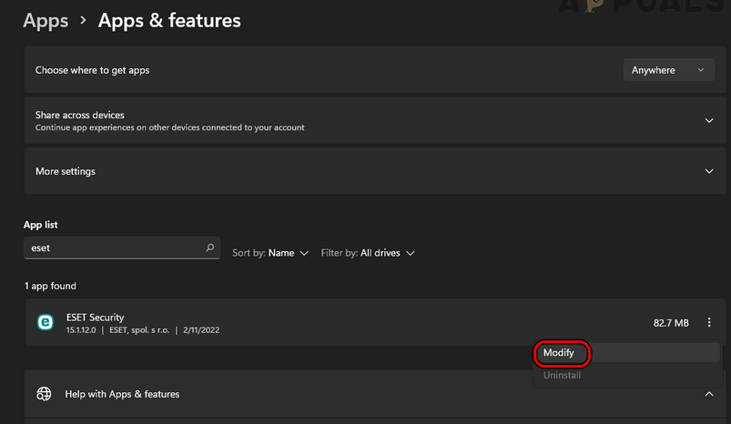 Open Apps & Features - Now locate ESET and expand its options.
