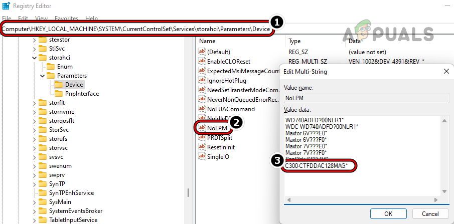- Now, in the right pane, double-click on NoLPM, and at the end of the list (without changing any other entry), add the name noted down/copied in step 21 with an asterisk sign at the end like the following (make sure to replace C300-CTFDDAC128MAG with your hard disk name):