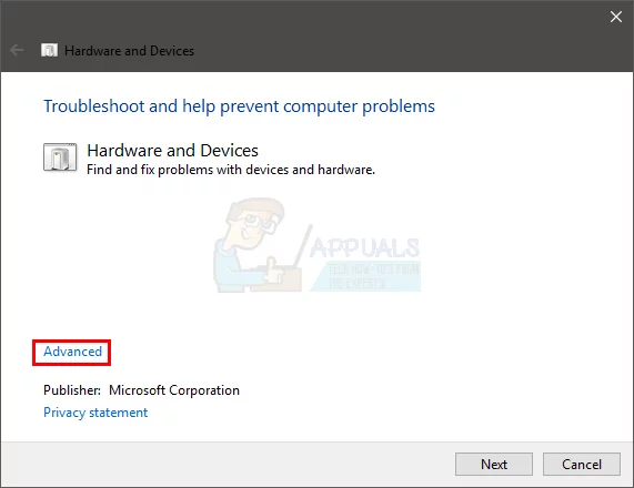Open Advanced in the Hardware Troubleshooter - Now click on Next and follow the prompts on your screen to complete the process. Make sure to apply the automatic repairs by the troubleshooter.
