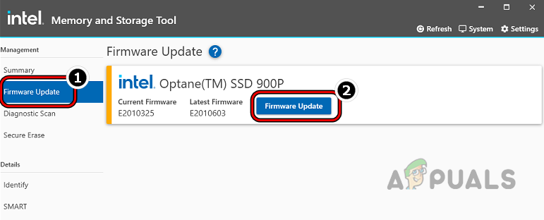The system may show the “reset to device” problem if the firmware (not the driver) of the problematic drive is outdated as it can make the drive incompatible with the OS and cause the issue. In this context, updating the firmware of your drive may resolve the DeviceRaidPort issue. It is strongly recommended that you backup the data on the drive before proceeding. As the process will differ for different drives, we will discuss the process of updating an Intel SSD by using the Intel Memory and Storage Tool (GUI). If the SSD drives are in RAID, then it is recommended to use Intel Memory and Storage Tool (CLI).