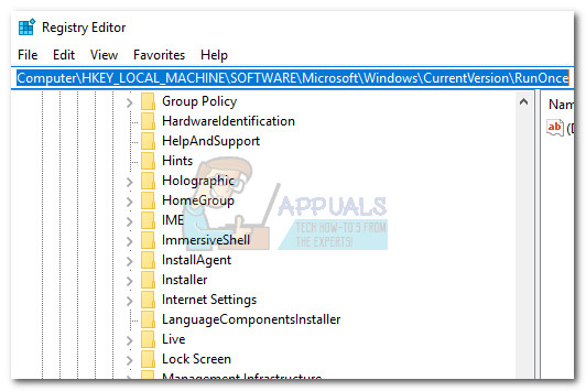 - In Registry Editor, use the left pane to navigate to Computer > HKEY_LOCAL_MACHINE > SOFTWARE > Microsoft > Windows > CurrentVersion > RunOnce, then move over to the right pane.
