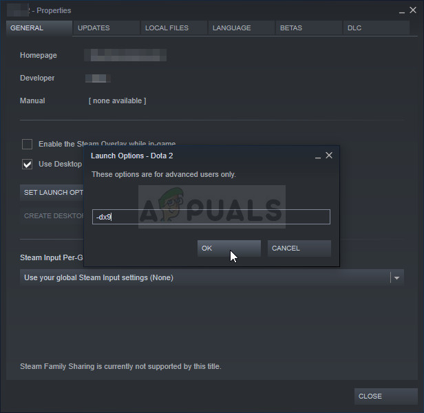 - Type “-dx9” in the bar. If there were some other launch options located there from before, make sure you separate this one with a space. Click the Ok button in order to confirm the changes.