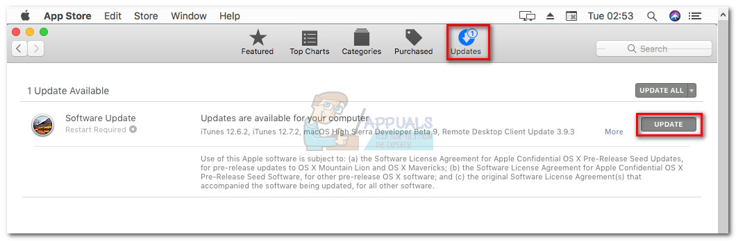 If you started experiencing this issue around that time and you’re still running O.S. Mavericks 10.9.5 or older, you have no other choice but to update your MacOS to the latest update release. To do this, open App Store from the dock and select the Updates tab. Then, apply all pending software updates by clicking the corresponding Update button or by choosing Update All.