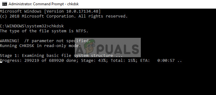 - Once in elevated command prompt, execute the command “chkdsk”. Do not enter the “/F” parameter or you will be stuck in the endless loop once again.