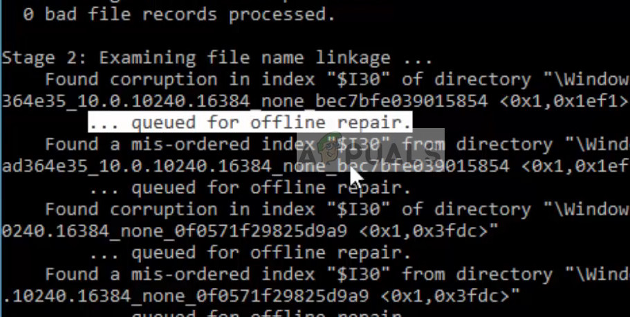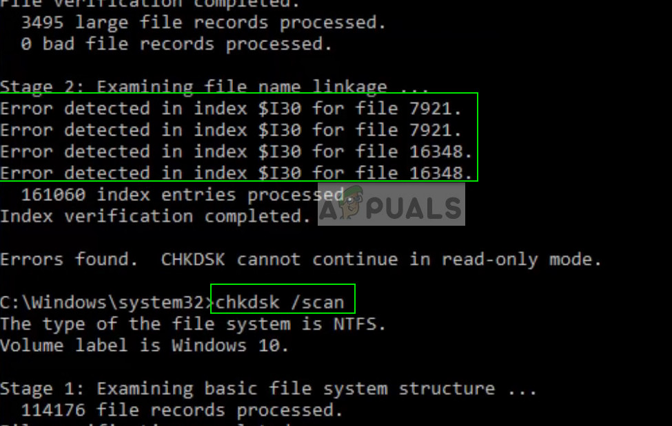 - If any errors were present like in the image below, execute the command “chkdsk /scan”.