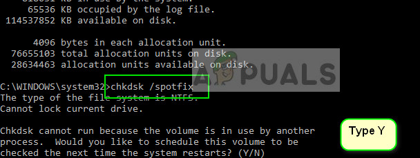 - Enter the command “chkdsk /spotfix” and press “Y” when you are prompted.