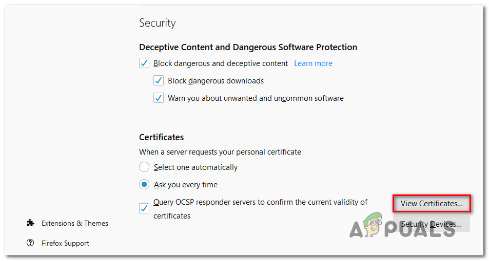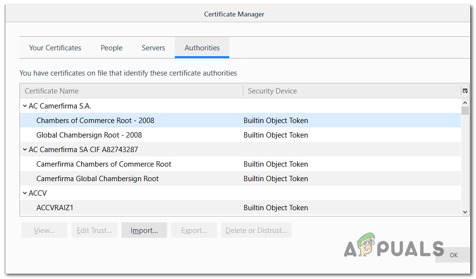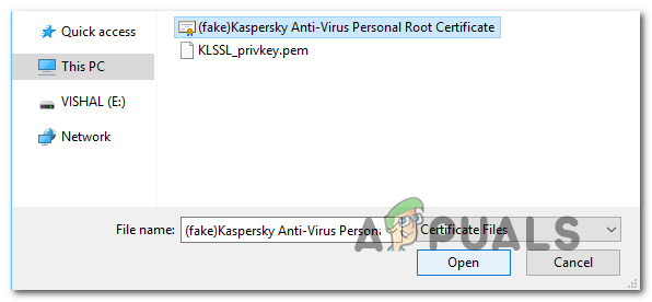 - Kaspersky Root Antivirus certificate is not installed on Firefox – If you’re using a 64-bit version of FireFox in conjunction with Kaspersky, chances are the issue is occurring because your Firefox installation is missing the antivirus root certificate. A quick trip to the Certificates menu should resolve the issue in this case.