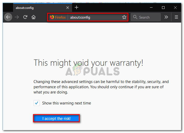 - . Open Firefox, type “about:config” and press Enter to enter the advanced settings of Mozilla Firefox. At the security prompt, click the I accept the risk! button.