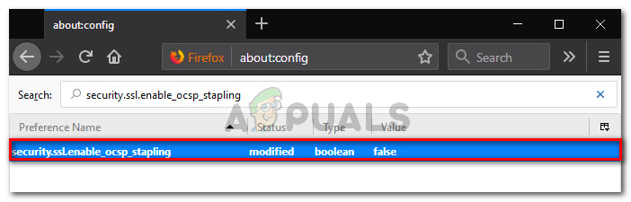 Locating the security.ssl.enable_ocsp_stapling preference value - Double-click on security.ssl.enable_ocsp_stapling to change it’s Value to false.