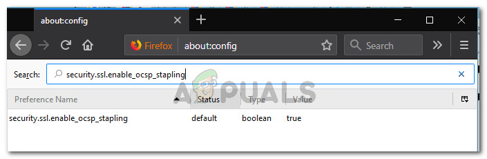 Disabling OCSP Stapling from the Config menu of Firefox - Restart your browser and see if the issue has been resolved.