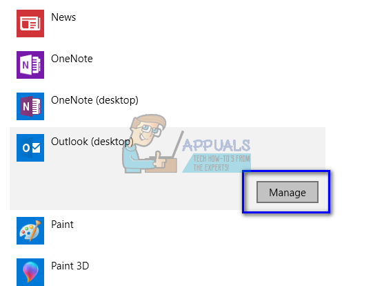 - Search through the list of application for “Outlook”. Click it and select “Manage”.