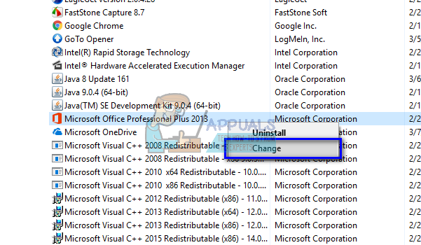 - Since Outlook is part of Microsoft Office installed on your computer, we need to repair outlook using it. After locating the office package, right-click on it and select “Change”.