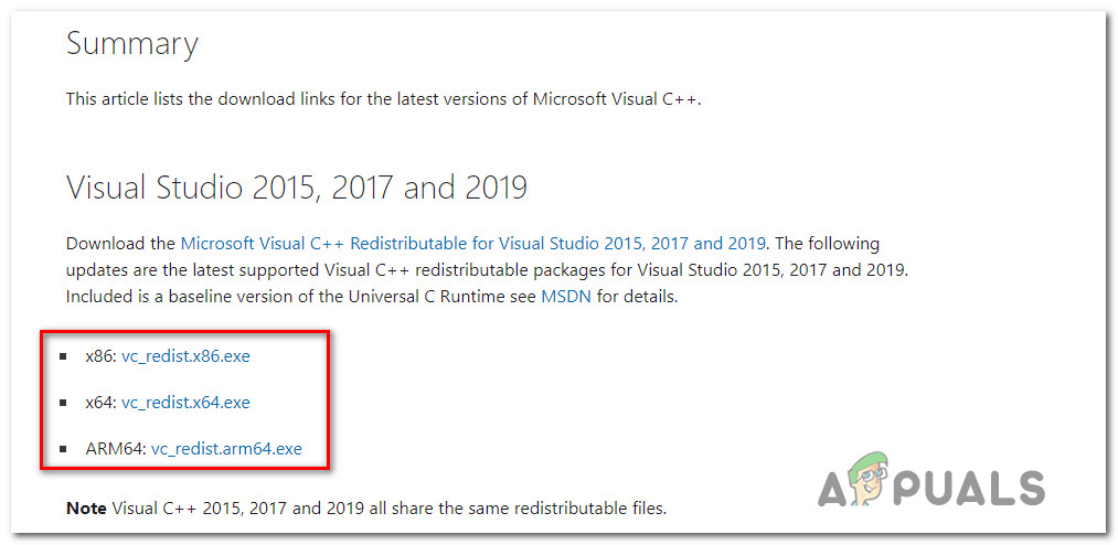 - Click on the missing VC++ dependency and follow the on-screen prompts to download the installer that’s compatible with the Windows bit-version currently running on your computer. If Microsoft asks you to install any bloatware, decline.