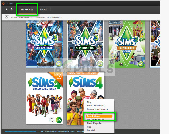 - Locate your Sims game, right-click it and select “Repair Game”.