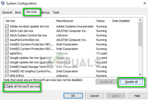 - Navigate to the Services tab present at the top of the screen. Check the line which says “Hide all Microsoft services”. Once you click this, all Microsoft related services will be disabled leaving behind all the third-party services (you can also disable all Microsoft related processes too and check more extensively if there are no third-party services causing the problem).