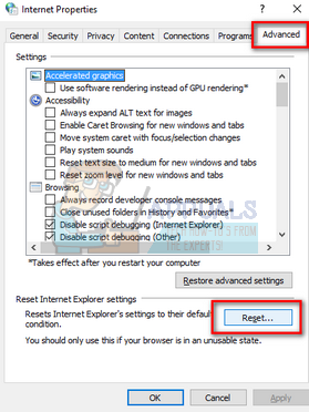 - Once in internet options, navigate to the advanced tab. Click “Reset” present at the near bottom of the screen.