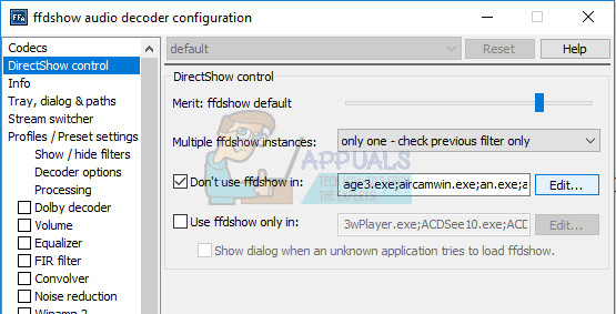 - Check the box next to the “Don’t use ffdshow in:” option and click on Edit.