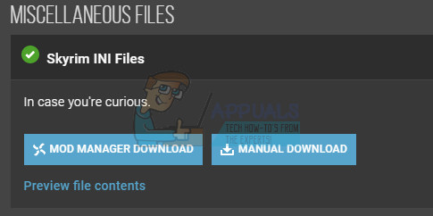 - Navigate to the Files tab and click on Skyrim INI Files >> Manual Download.