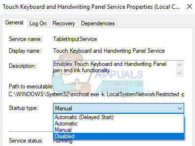 Open Properties of Touch Keyboard and Handwriting Panel Service - Make sure that the option under Startup type in Touch Keyboard and Handwriting Panel Service’s Properties is set to Disabled.