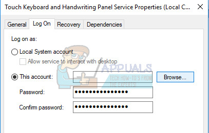 “Windows could not stop the Touch Keyboard and Handwriting Panel Service on Local Computer. Error 1079: The account specified for this service differs from the account specified for other services running in the same process.”