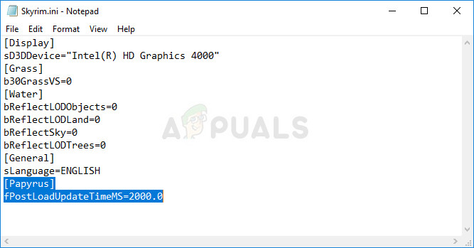 - Type “fPostLoadUpdateTimeMS” in the box and change the value next to it from the previous value to 2000.0. Use the Ctrl + S key combination in order to save the changes or click File >> Save and exit Notepad. If you don’t find this line, simply navigate or create the [Papyrus] section and make sure your the line looks like on the picture below: