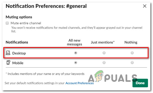 Accessing the Notification Preferences menu - Then, from the Notifications Preferences menu, set the Desktop toggle to All new message and click Done.