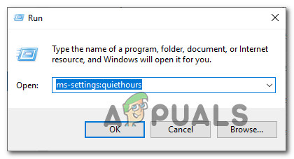 - Press Windows key + R to open up a Run dialog box. Then, type “ms-settings:quiethours” and press Enter to open the Quite Hours (Focus Assist) tab of the Settings app.