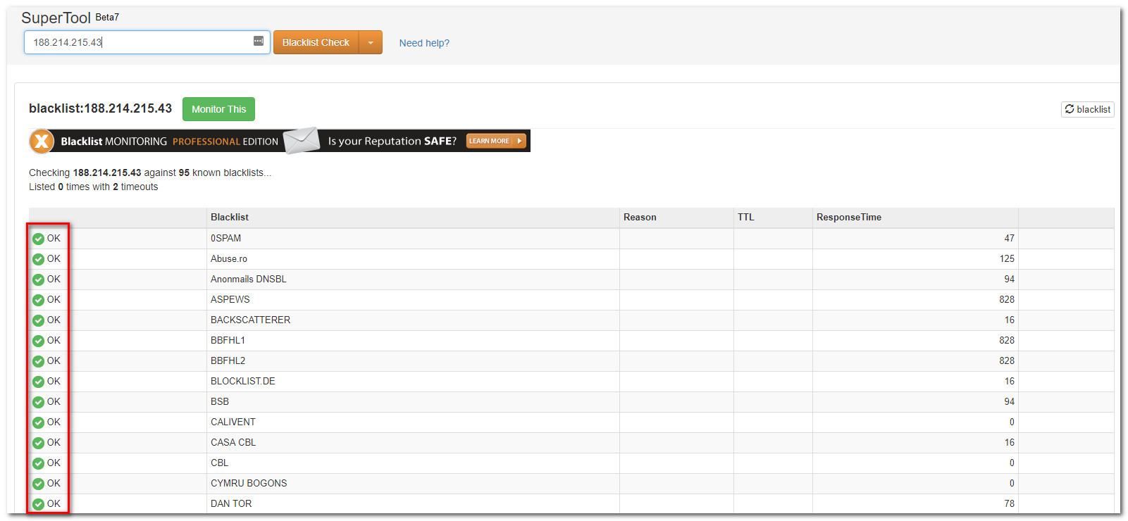 Fortunately, there is an easy way to verify whether this scenario is applicable to your current situation. You can use a tool that will test the IP address of your mail server over 100 DNS based email blacklists ( Real-time blacklist, DNSBL, RBL).