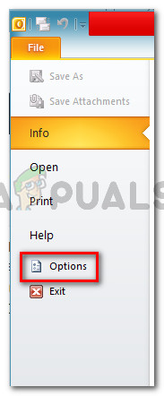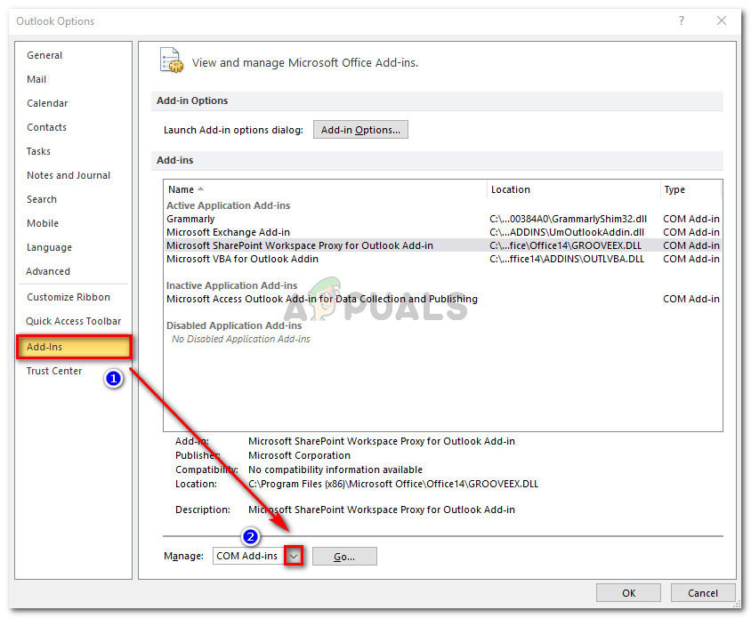 Opening the Options menu inside Outlook - Inside the Outlook Options screen, click on the Add-ins menu from the left menu. Then, move over to the right menu, set the drop-down menu associated with Manage to Com Add-ins and click Go.