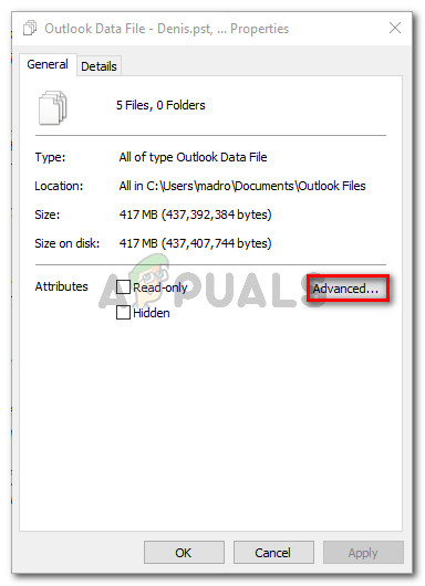Accessing the Properties screen of every PST (OST) file - In the Properties window of the selected files, go to the General tab and click on Advanced.