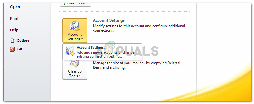 Disabling Outlook indexing - Return to Outlook and go to File > Account settings and click on Account Settings from the newly appeared drop-down menu.