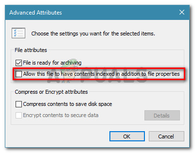 Opening the Advanced menu of the selected files - In the Advanced Attributes menu, make sure that the box associated with Allow this file to have contents indexed in addition to file properties is checked. Then, click Ok and Apply to save the changes.