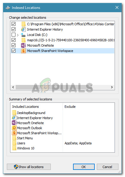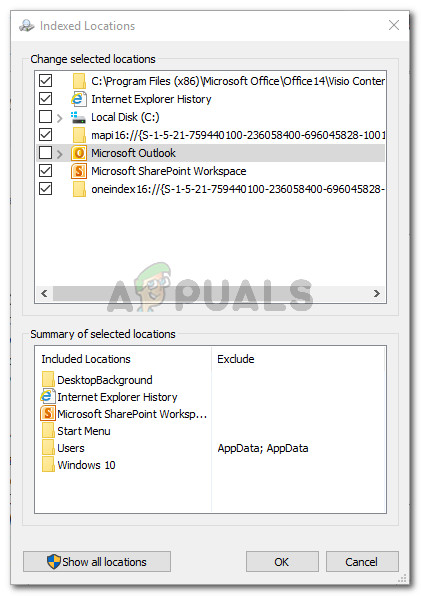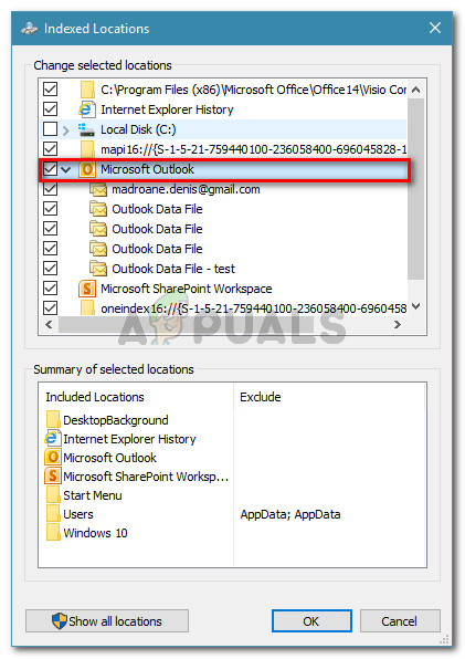 Modifying the Indexing Options - In the Indexed Location menu, check the box next to Microsoft Outlook to include it among the selected locations. Skip this step if Microsoft Outlook already appears under Summary of selected locations. Then, hit Ok to save the changes.