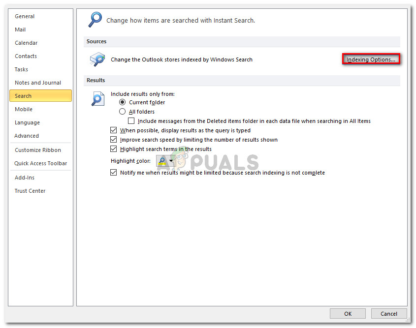 Opening the Options menu inside Outlook - Inside Outlook’s Options menu, go to the Search sub-menu and click Indexing Options under Sources.