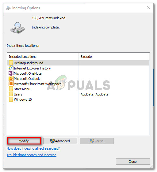 Accessing the Indexing Options Menu from Outlook’s settings - Inside the Indexing Options menu, click on Modify, then uncheck Microsoft Outlook. Once the entry is deselected, click Ok and then Close to save the changes.