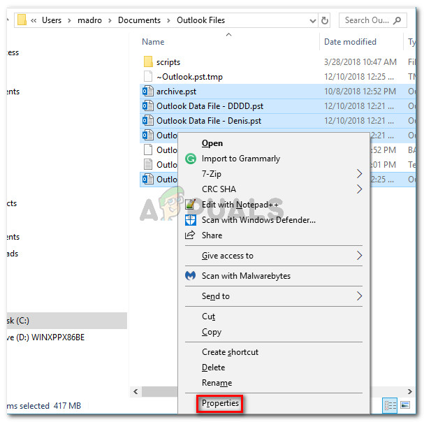 Discovering the location of the active PST (OST) file - Close Outlook, open Windows Explorer (File Explorer) and go to the location you previously noted down. Once you arrive at that location, hold down Ctrl and click on each .pst (or .ost) file to select them all, then right click on one and choose Properties.