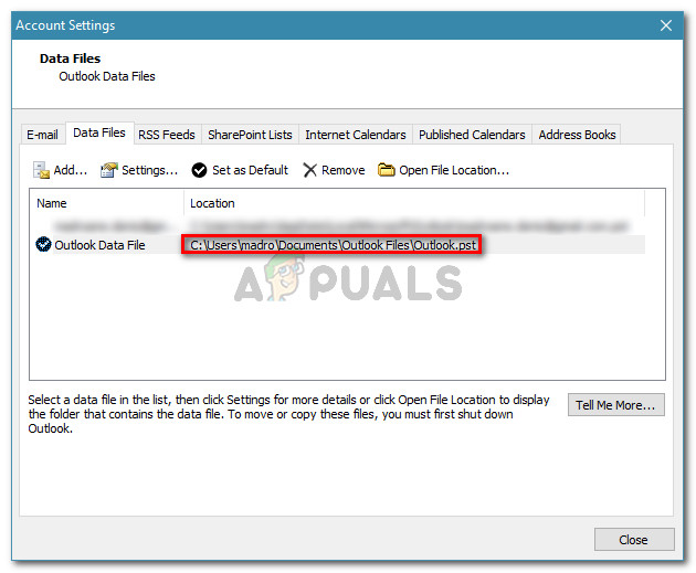 Accessing the Account Settings menu in Outlook - In the Account Settings window, go to the Data Files tab. Then, note down the location of the OST or PST file that is set as the default.