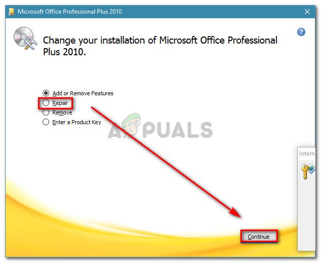 Accessing the repair menu of the Microsoft Office installation - Inside the repair menu, select the Repair option and click Continue.