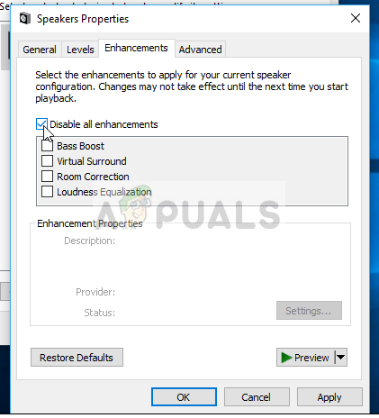 - Now head over to the Enhancements tab and uncheck all the enhancements enabled (you can also check the box which says “Disable all enhancements”).