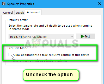 - Now select the Advanced tab and uncheck the exclusive mode where applications are allowed to override the settings. Save your changes and exit.