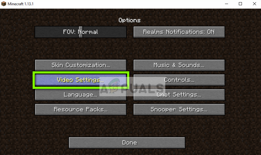 - Launch Minecraft in your computer and click on Options when the screen loads up completely. If you have installed Minecraft from the Windows store, click Settings instead (the Options button will not be available).