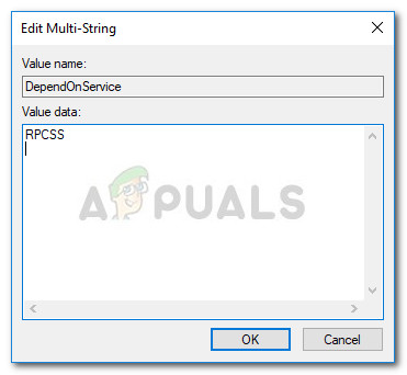 - Next, move over to the right-hand pane and double click on DependOnService to view its value. In the Edit Multi-String window, delete any Value data and replace it with RPCSS. Don’t forget to hit Ok to save the changes.