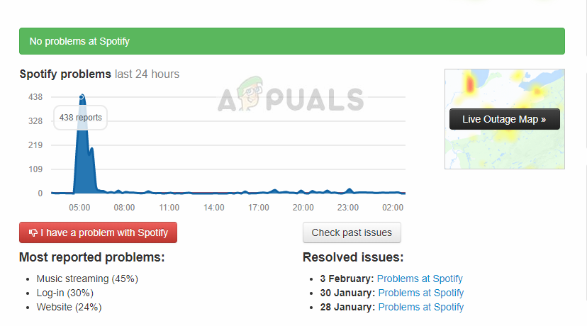 You can check several third-party websites and see if Spotify is down indeed. If you see a spike in the number of reports, it probably means that there is some issue. This will usually get fixed within a short period of time. If the platform is down, come back later after a while and try again.