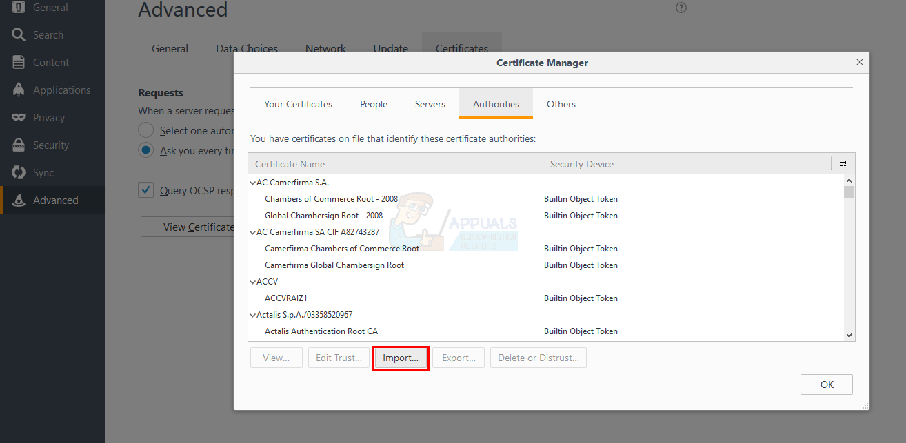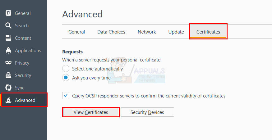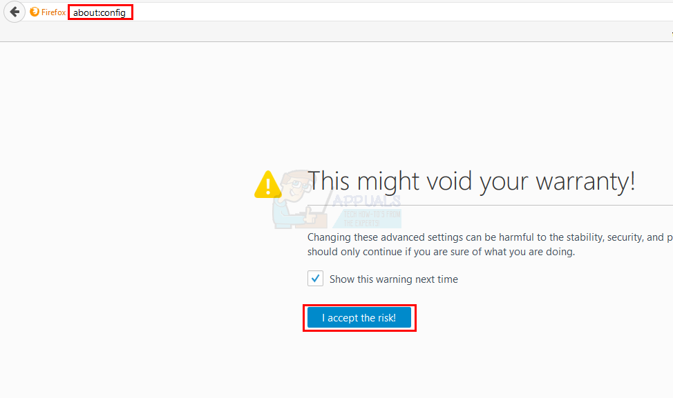 Note: This method will change the settings of Mozilla Firefox to ignore the SSL Certificate warnings. This can be harmful to your system especially if you access an unsafe website. There are a lot of websites that use fake certificates to trick visitors. These websites will try to steal important information from you. Your browser recognizes the fake certificates and prevents you from accessing websites like these with the error message. So, changing the settings of your browsers to ignore these warnings is not recommended. But, the steps for this are given below for anyone who still wants to go through this and knows what he/she is doing.