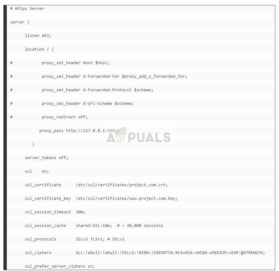 Another change which you can try to resolve the error is changing the nginx.conf file. This solution is specific for people who are using Nginx to run their site. The same principle applies that is we tweaking settings regarding the 443 port.