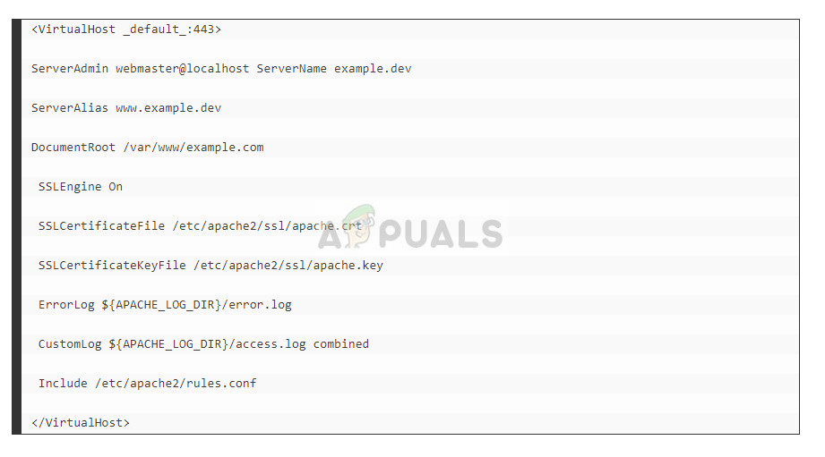 - In Apache, check that the Listen <port> directive matches the port number in the VirtualHost directive for the website being secured, and that the SSL configuration statements (SSLEngine On, SSLCertificateFile <filename> and so on) appear in the VirtualHost directive for the website or in the SSL configuration file for the server.