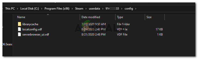 The Folder that you have to navigate to - There should be a localconfig.vdf file present inside this folder to it might be replaced with your username or a random number but it will most certainly be a “.cfg” file located inside this folder.