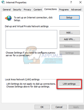 - When the settings are opened, click on “LAN Settings” in the Connections tab, present in the bottom.
