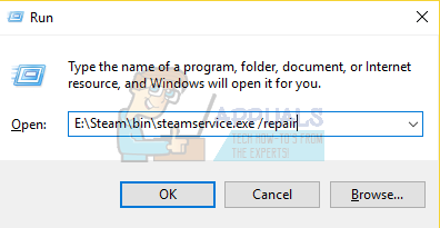- In the dialogue box, type the address of your Steam directory, followed by bin, then the exe and finally followed by a space and a “/repair”.